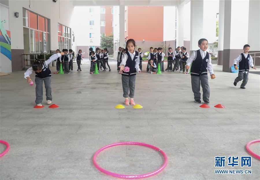 10月16日,一年级2班的学生在体育课上参加创意游戏。 当日,复旦大学附属徐汇实验学校为一年级“萌娃”们安排了一堂内容丰富的体育课。体育老师用沙包、塑料桩等工具设计创意游戏,带领小朋友们感受运动的乐趣。 新华社记者丁汀摄