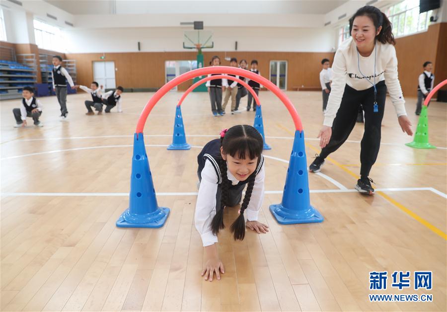 10月16日,一年级4班的学生在体育课上参加创意游戏。 当日,复旦大学附属徐汇实验学校为一年级“萌娃”们安排了一堂内容丰富的体育课。体育老师用沙包、塑料桩等工具设计创意游戏,带领小朋友们感受运动的乐趣。 新华社记者丁汀摄