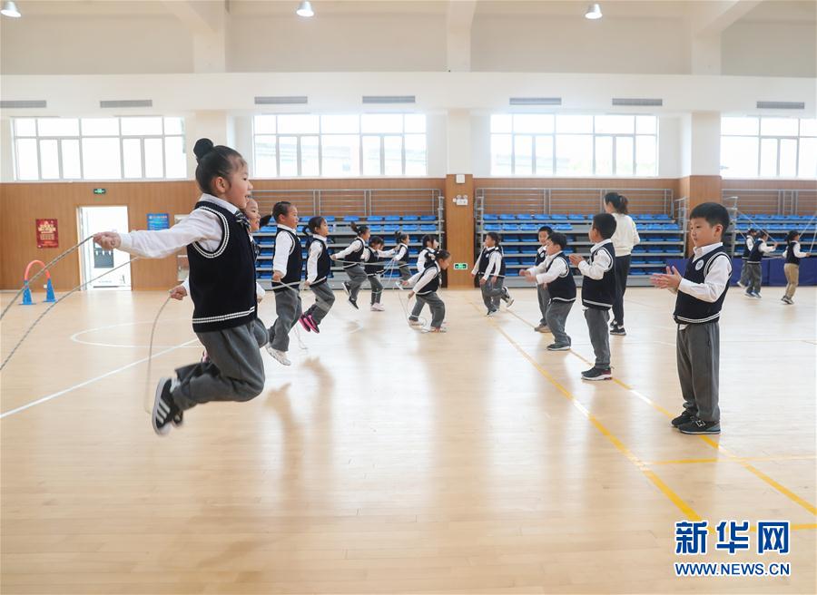 10月16日,一年级4班的学生在体育课上跳绳。 当日,复旦大学附属徐汇实验学校为一年级“萌娃”们安排了一堂内容丰富的体育课。体育老师用沙包、塑料桩等工具设计创意游戏,带领小朋友们感受运动的乐趣。 新华社记者丁汀摄