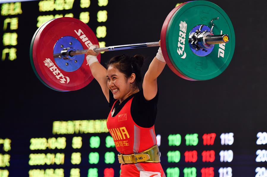 10月16日,湖南中联重科队选手朱巧玲在抓举成功后庆祝。 当日,在“崀山杯”2020年全国女子举重锦标赛暨东京奥运会模拟赛55公斤级A组比赛中,湖南中联重科队选手朱巧玲以抓举93公斤,挺举120公斤,总成绩213公斤获得第六名。 新华社记者陈思汗摄
