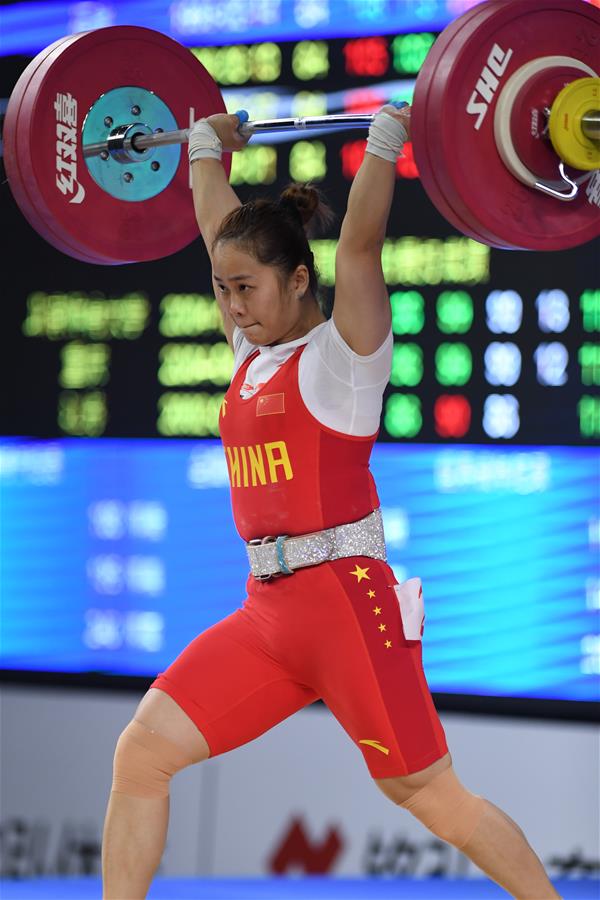 10月17日,福建队选手邓薇在挺举比赛中。 当日,在湖南省邵阳市举行的“崀山杯”2020年全国女子举重锦标赛暨东京奥运会模拟赛64公斤级A组比赛中,福建队选手邓薇以抓举113公斤,挺举138公斤,总成绩251公斤获得第一名。 新华社记者薛宇舸摄