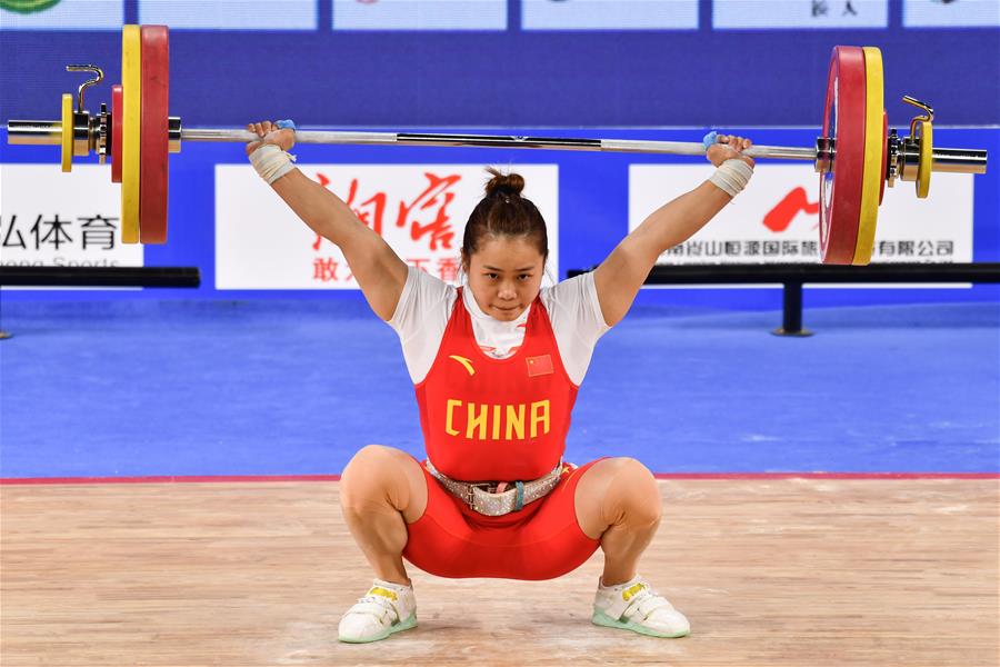 10月17日,福建队选手邓薇在抓举比赛中。 当日,在湖南省邵阳市举行的“崀山杯”2020年全国女子举重锦标赛暨东京奥运会模拟赛64公斤级A组比赛中,福建队选手邓薇以抓举113公斤,挺举138公斤,总成绩251公斤获得第一名。 新华社记者陈思汗摄