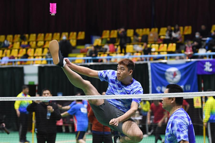 10月17日,和合昌岽盛一队队员李博(左)在毽球比赛中。 当日,2020年北京毽球交流大会在北京市朝阳体育馆举办,本次毽球交流大会设毽球和平踢毽两大项,共有58支代表队、近500名毽球爱好者参加。 新华社记者鞠焕宗摄