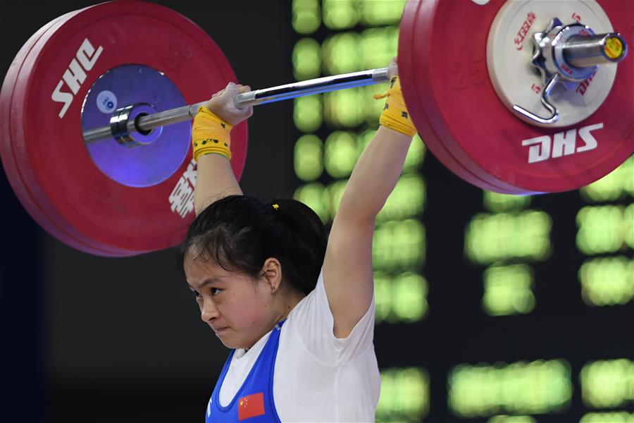 10月17日,湖南中联重科队选手罗诗芳在挺举比赛中。 当日,在湖南省邵阳市举行的“崀山杯”2020年全国女子举重锦标赛暨东京奥运会模拟赛59公斤级A组比赛中,湖南中联重科队选手罗诗芳以抓举103公斤,挺举130公斤,总成绩233公斤获得第一名,其中挺举成绩和总成绩打破了59公斤级全国青年纪录。 新华社记者薛宇舸摄