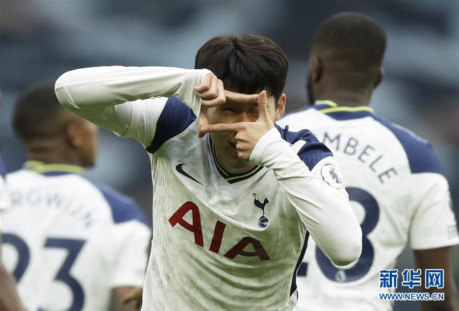 10月18日,热刺队球员孙兴民在进球后庆祝。 当日,在2020-2021赛季英格兰足球超级联赛第五轮比赛中,西汉姆联队客场以3比3战平托特纳姆热刺队。 新华社/路透