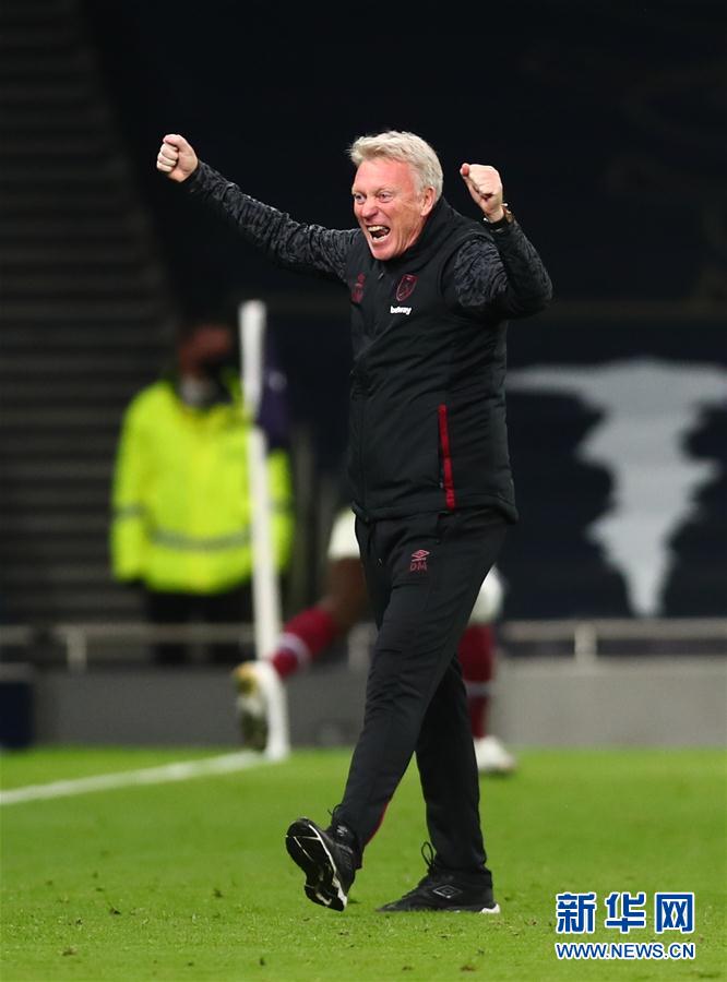 10月18日,西汉姆联队主教练莫耶斯在兰奇尼攻入扳平一球后庆祝 当日,在2020-2021赛季英格兰足球超级联赛第五轮比赛中,西汉姆联队客场以3比3战平托特纳姆热刺队。 新华社/路透