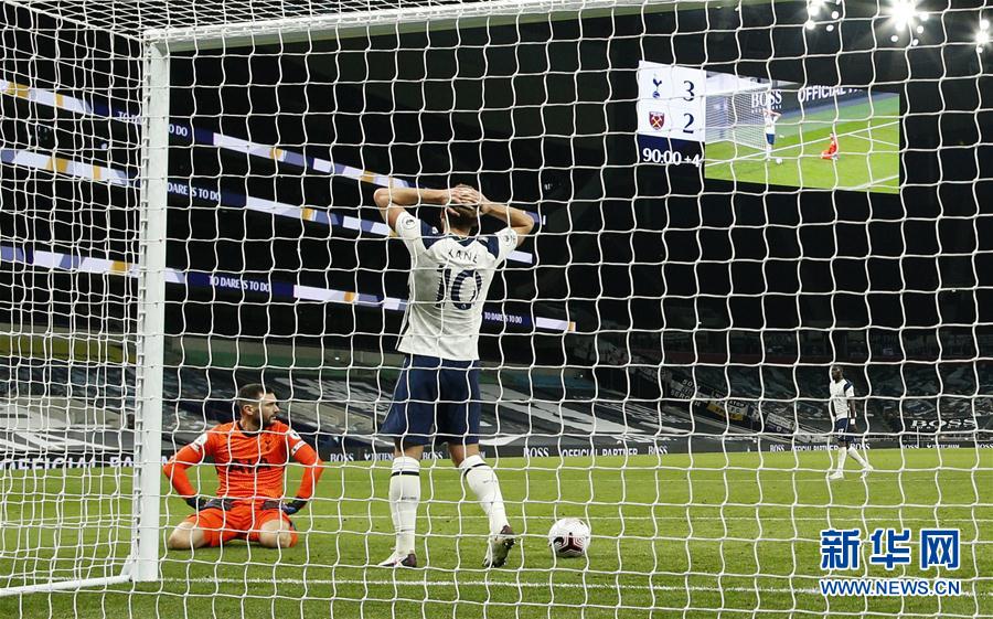 10月18日,热刺队球员凯恩(中)和守门员洛里在西汉姆联队球员兰奇尼打入扳平一球后神情黯然。 当日,在2020-2021赛季英格兰足球超级联赛第五轮比赛中,西汉姆联队客场以3比3战平托特纳姆热刺队。 新华社/路透