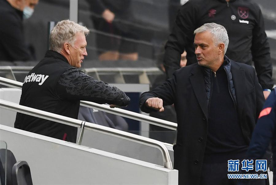 10月18日,西汉姆联队主教练莫耶斯(左)在赛前和热刺队主教练穆里尼奥致意。 当日,在2020-2021赛季英格兰足球超级联赛第五轮比赛中,西汉姆联队客场以3比3战平托特纳姆热刺队。 新华社/路透