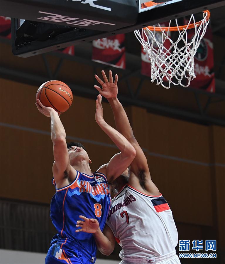 10月18日,新疆伊力特队球员唐才育(左)在比赛中上篮。 当日,在浙江诸暨举行的2020-2021中国男子篮球职业联赛(CBA)第一阶段首轮比赛中,新疆伊力特队以102比97战胜时代中国广州队。 新华社记者 沙达提 摄