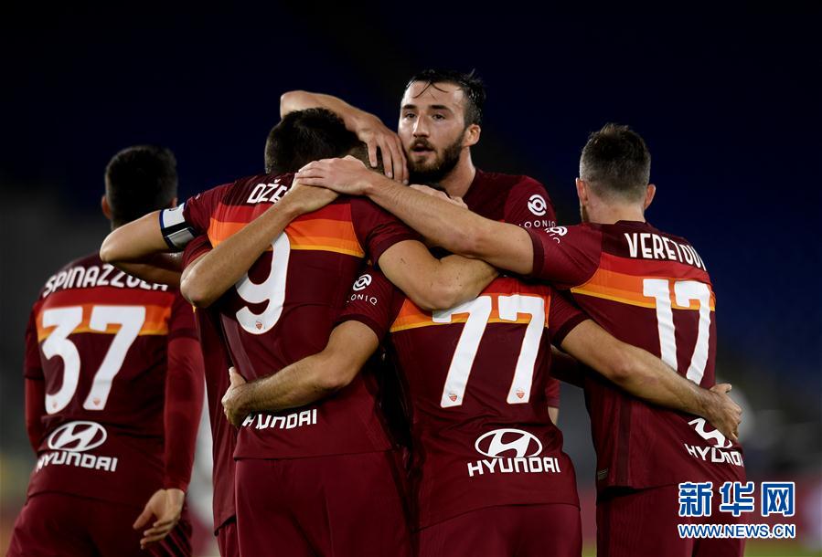 10月18日,罗马队球员在比赛中庆祝哲科的进球。 当日,在2020-2021赛季意大利足球甲级联赛第四轮比赛中,罗马队主场以5比2战胜贝内文托队。 新华社发(阿尔贝托·林格利亚 摄)