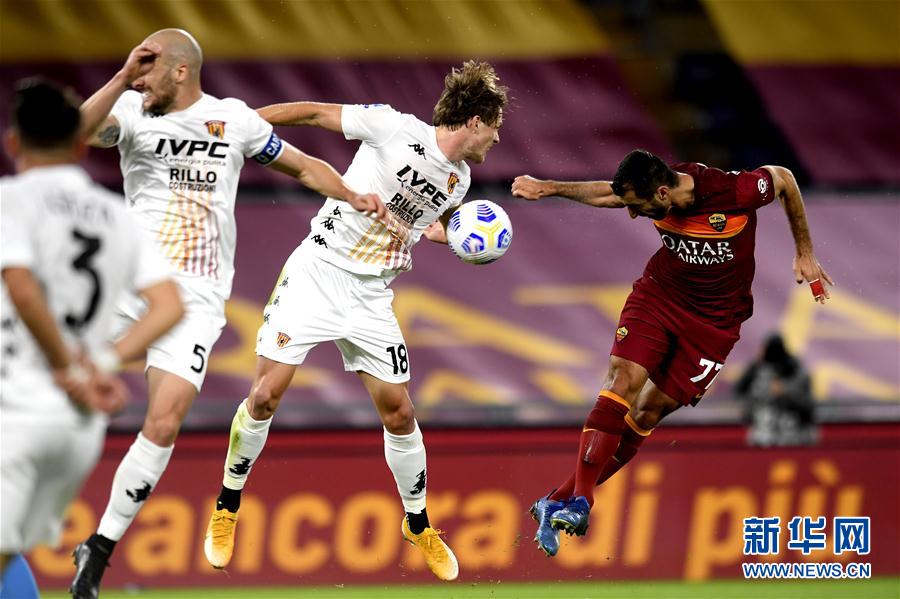 10月18日,罗马队球员姆希塔良(右一)在比赛中门前争顶。 当日,在2020-2021赛季意大利足球甲级联赛第四轮比赛中,罗马队主场以5比2战胜贝内文托队。 新华社发(阿尔贝托·林格利亚 摄)