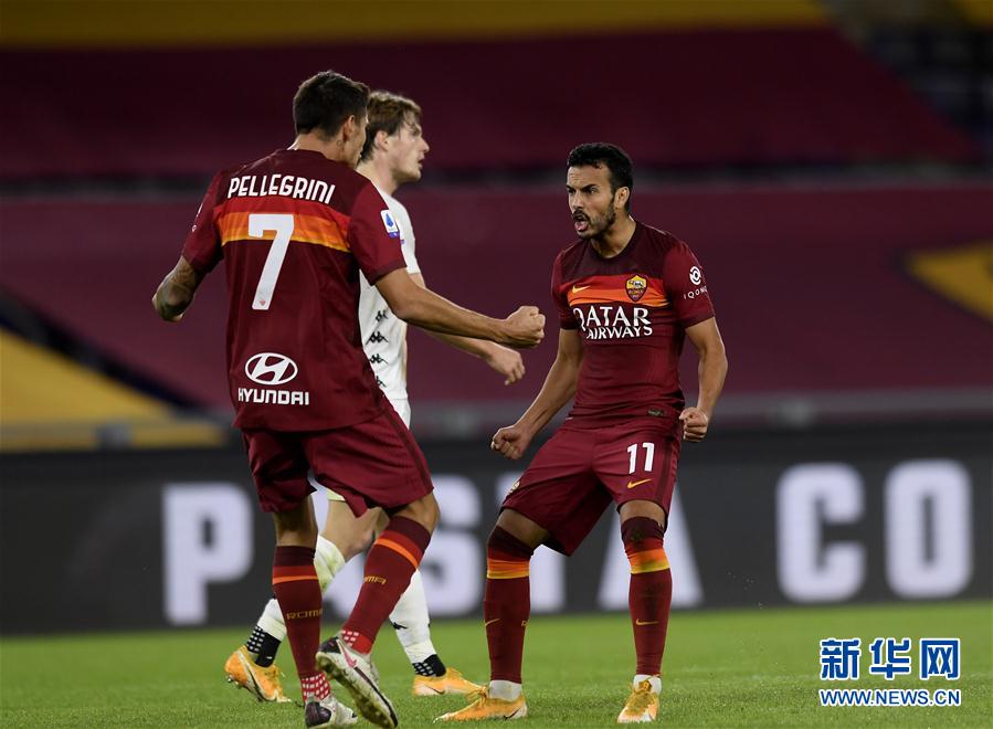 10月18日,罗马队球员佩德罗(右)在进球后庆祝。 当日,在2020-2021赛季意大利足球甲级联赛第四轮比赛中,罗马队主场以5比2战胜贝内文托队。 新华社发(阿尔贝托·林格利亚 摄)