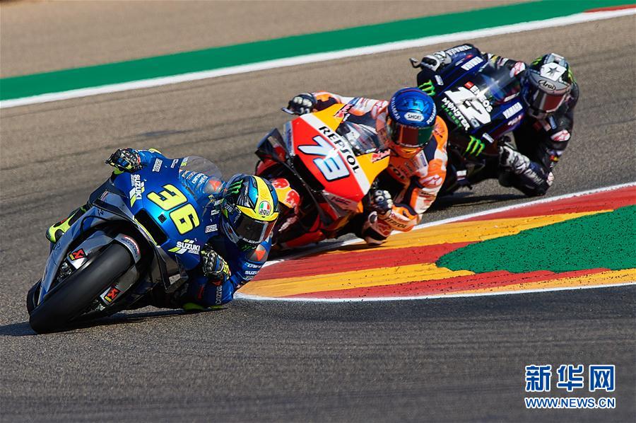 10月18日,铃木车队车手胡安·米尔、雷普索尔本田车队车手亚历克斯·马奎斯和雅马哈车队车手马维里克·维纳勒斯(从左至右)在比赛中。 当日,2020年世界摩托车锦标赛阿拉贡站MOTOGP比赛在西班牙阿尔卡尼斯举行。 新华社发(帕布罗·莫拉诺摄)