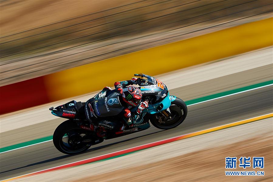 10月18日,雅马哈车队车手法比奥·夸塔拉罗在比赛中。 当日,2020年世界摩托车锦标赛阿拉贡站MOTOGP比赛在西班牙阿尔卡尼斯举行。 新华社发(帕布罗·莫拉诺摄)