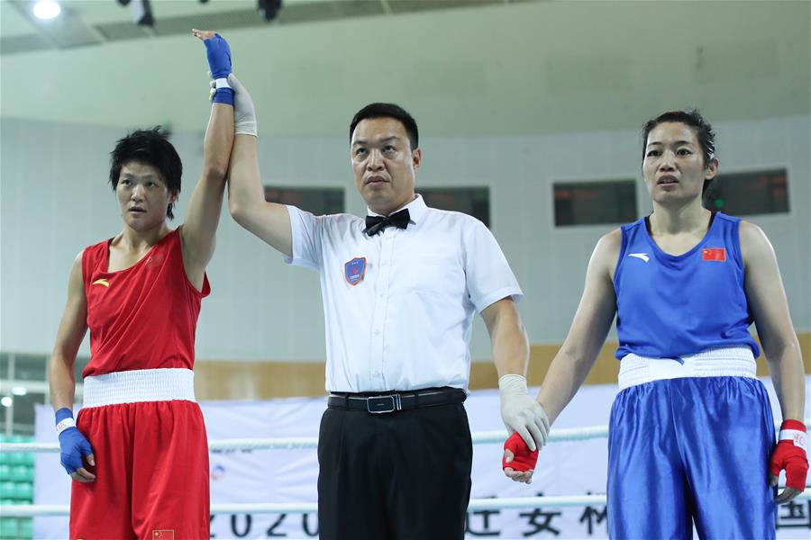 10月19日,裁判宣布陕西队选手谷红(左)战胜山西队选手王冬梅。 当日,在河北省迁安市唐山九江体育中心进行的2020年“迁安杯”全国女子拳击锦标赛69公斤级预赛中,陕西队选手谷红以5比0战胜山西队选手王冬梅,晋级下一轮。 新华社记者 欧东衢 摄