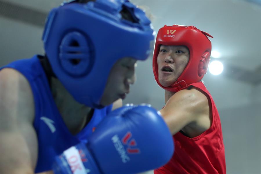 10月19日,陕西队选手谷红(右)与山西队选手王冬梅在69公斤级预赛中。 当日,在河北省迁安市唐山九江体育中心进行的2020年“迁安杯”全国女子拳击锦标赛69公斤级预赛中,陕西队选手谷红以5比0战胜山西队选手王冬梅,晋级下一轮。 新华社记者 欧东衢 摄