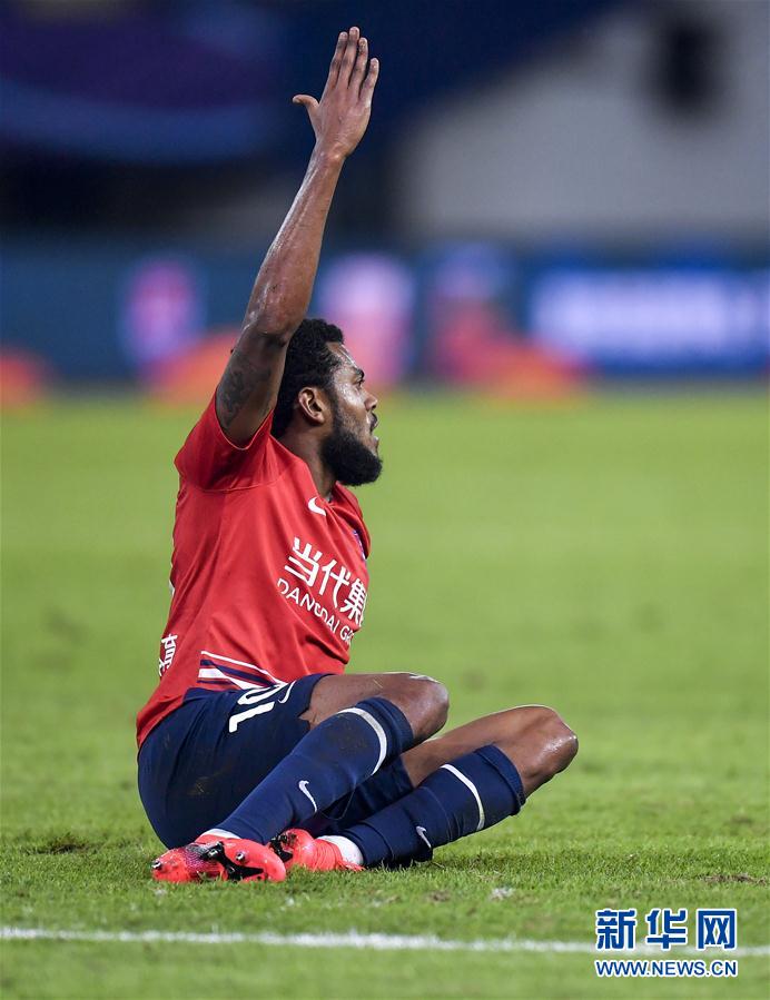 10月19日,重庆当代队球员西里诺在比赛中举手向主裁判示意对手犯规。 当日,在2020赛季中国足球协会超级联赛(苏州赛区)第15轮比赛中,重庆当代队以1比1战平江苏苏宁易购队。 新华社记者 许畅 摄
