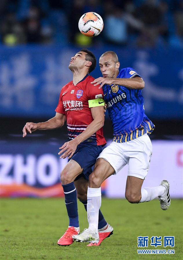 10月19日,重庆当代队球员卡尔德克(左)在比赛中与江苏苏宁易购队球员米兰达拼抢。 当日,在2020赛季中国足球协会超级联赛(苏州赛区)第15轮比赛中,重庆当代队以1比1战平江苏苏宁易购队。 新华社记者 许畅 摄