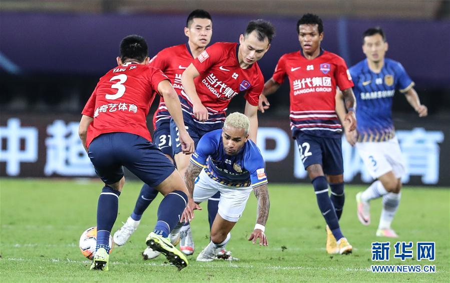 10月19日,江苏苏宁易购队球员特谢拉(下)在比赛中进攻受阻。 当日,在2020赛季中国足球协会超级联赛(苏州赛区)第15轮比赛中,重庆当代队以1比1战平江苏苏宁易购队。 新华社记者 杨磊 摄