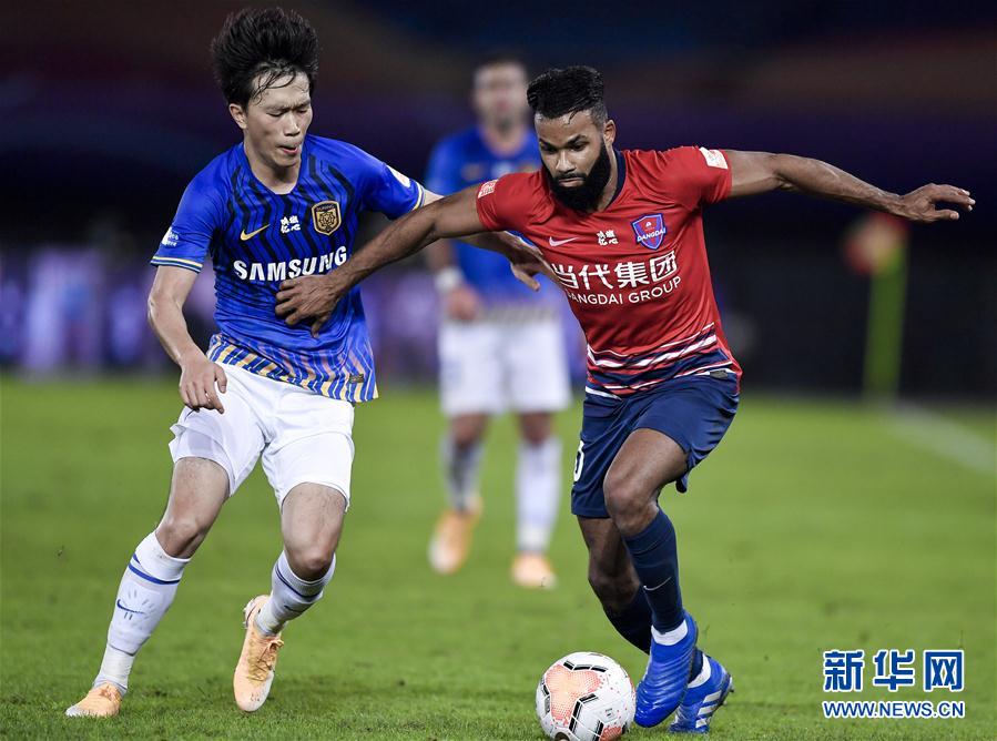 10月19日,重庆当代队球员费尔南迪尼奥(右)在比赛中带球进攻。 当日,在2020赛季中国足球协会超级联赛(苏州赛区)第15轮比赛中,重庆当代队以1比1战平江苏苏宁易购队。 新华社记者 许畅 摄