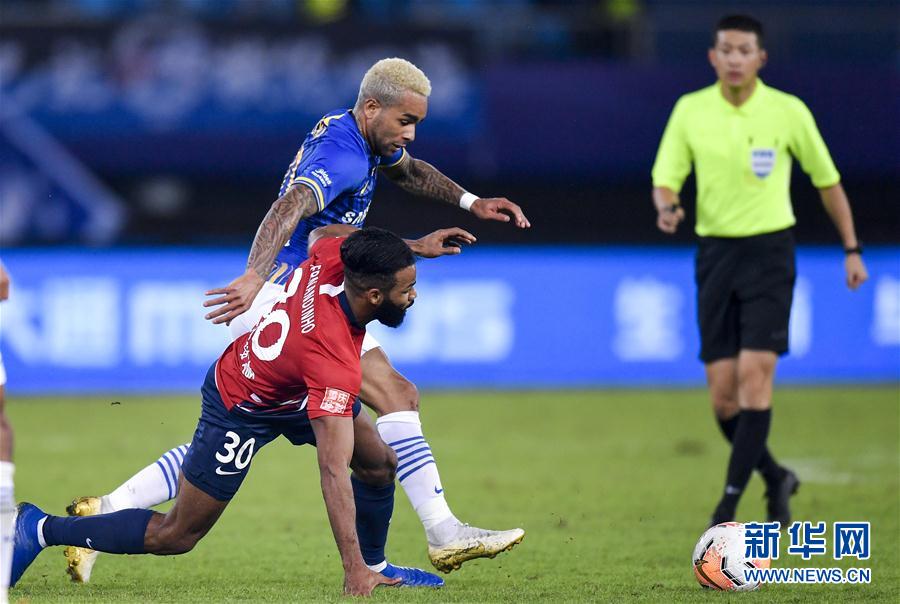 10月19日,重庆当代队球员费尔南迪尼奥(前)在比赛中与江苏苏宁易购队球员特谢拉拼抢。 当日,在2020赛季中国足球协会超级联赛(苏州赛区)第15轮比赛中,重庆当代队以1比1战平江苏苏宁易购队。 新华社记者 许畅 摄