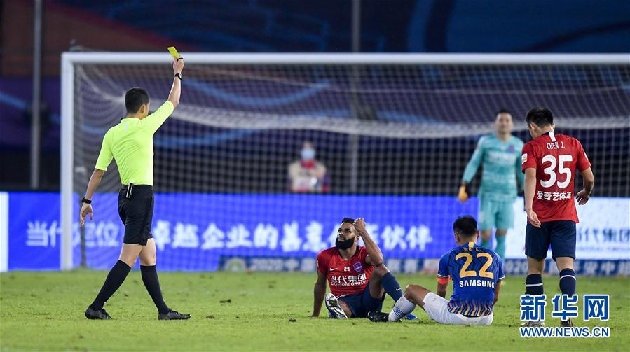 10月19日,主裁判张雷(左一)向重庆当代队球员费尔南迪尼奥(左二)出示黄牌。 当日,在2020赛季中国足球协会超级联赛(苏州赛区)第15轮比赛中,重庆当代队以1比1战平江苏苏宁易购队。 新华社记者 许畅 摄