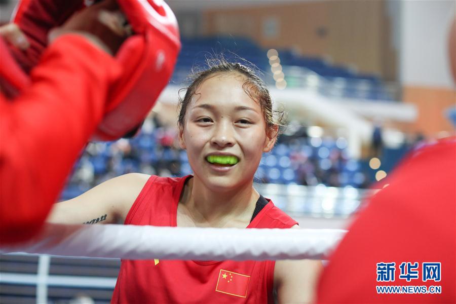 10月20日,河北九江队选手常园在获胜后摘掉护具。 当日,在河北省迁安市唐山九江体育中心进行的2020年“迁安杯”全国女子拳击锦标赛51公斤级四分之一决赛中,河北九江队选手常园以5比0战胜吉林队选手李明艳,晋级四强。 新华社记者 欧东衢 摄