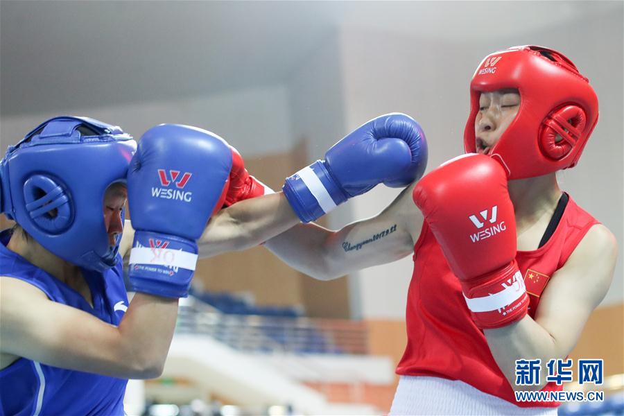 10月20日,河北九江队选手常园(右)与吉林队选手李明艳在比赛中。 当日,在河北省迁安市唐山九江体育中心进行的2020年“迁安杯”全国女子拳击锦标赛51公斤级四分之一决赛中,河北九江队选手常园以5比0战胜吉林队选手李明艳,晋级四强。 新华社记者 欧东衢 摄