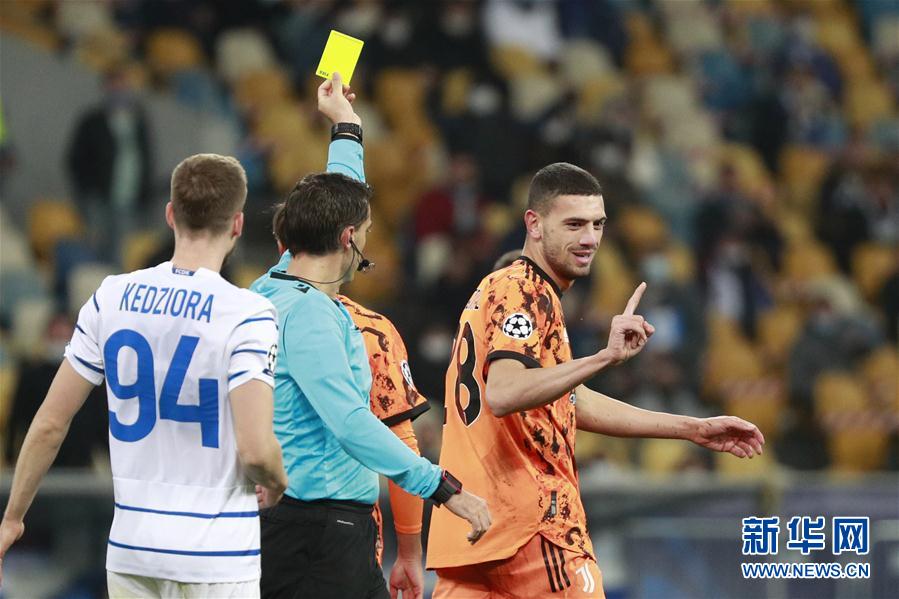 10月20日,尤文图斯队球员德米拉尔(右)被出示黄牌。 当日,在乌克兰基辅进行的2020-2021赛季欧洲足球冠军联赛小组赛G组首轮比赛中,意甲尤文图斯队客场以2比0战胜乌克兰基辅迪纳摩队。 新华社/美联
