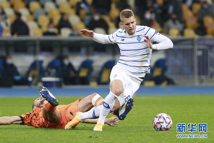 10月20日,尤文图斯队球员德米拉尔(左)和基辅迪纳摩队球员苏普里亚哈在比赛中拼抢。 当日,在乌克兰基辅进行的2020-2021赛季欧洲足球冠军联赛小组赛G组首轮比赛中,意甲尤文图斯队客场以2比0战胜乌克兰基辅迪纳摩队。 新华社/美联