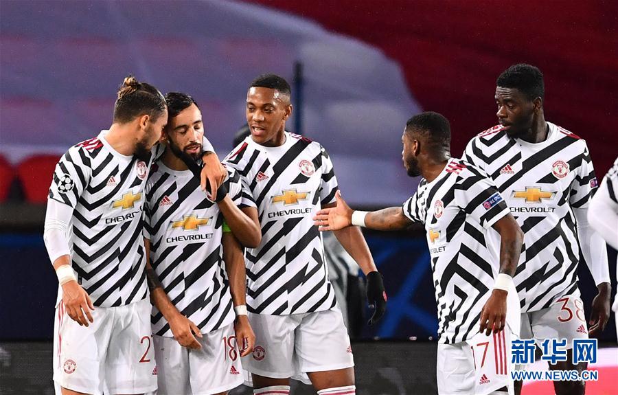 10月20日,曼联队球员布鲁诺·费尔南德斯(左二)在进球后和队友庆祝。 当日,在2020-2021赛季欧洲足球冠军联赛小组赛H组首轮比赛中,英超曼联队客场以2比1战胜法甲巴黎圣日耳曼队。 新华社/法新