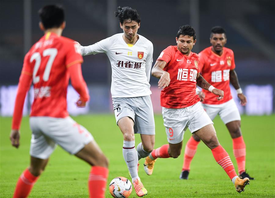 10月21日,河北华夏幸福队球员罗森文(左二)在比赛中带球。 当日,在2020赛季中国足球协会超级联赛(苏州赛区)第16轮比赛中,河北华夏幸福队以0比5不敌广州恒大淘宝队。最终河北华夏幸福队以两轮总比分1比8负于广州恒大淘宝队,无缘四强。 新华社记者 许畅 摄