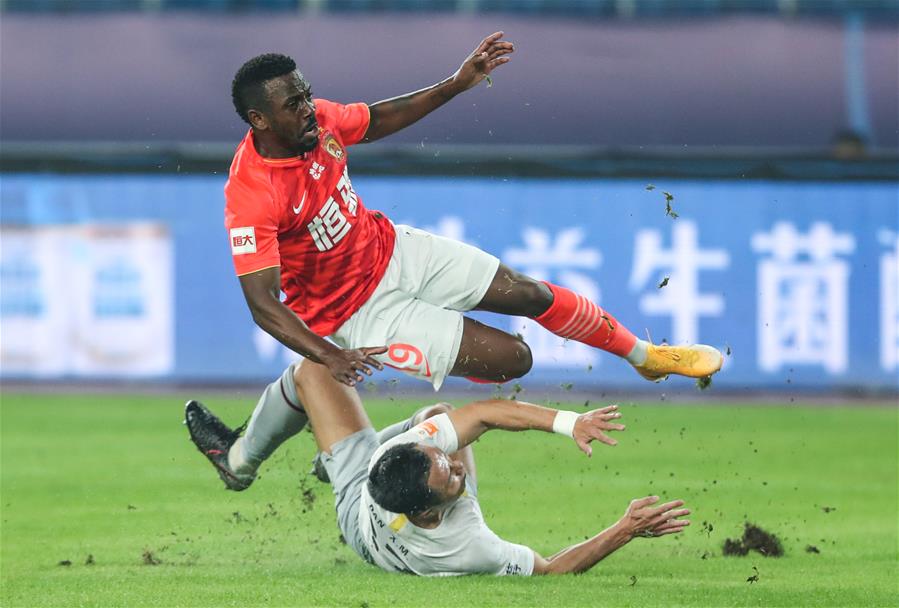 10月21日,河北华夏幸福队球员潘喜明(下)与广州恒大淘宝队球员费南多在比赛中拼抢。 当日,在2020赛季中国足球协会超级联赛(苏州赛区)第16轮比赛中,河北华夏幸福队以0比5不敌广州恒大淘宝队。最终河北华夏幸福队以两轮总比分1比8负于广州恒大淘宝队,无缘四强。 新华社记者杨磊摄