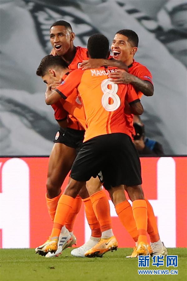 10月21日,顿涅茨克矿工队球员在比赛中庆祝进球。 当日,在2020-2021赛季欧洲足球冠军联赛小组赛B组首轮比赛中,西甲皇家马德里队主场以2比3不敌乌克兰顿涅茨克矿工队。 新华社发(爱德华·皮特斯摄)