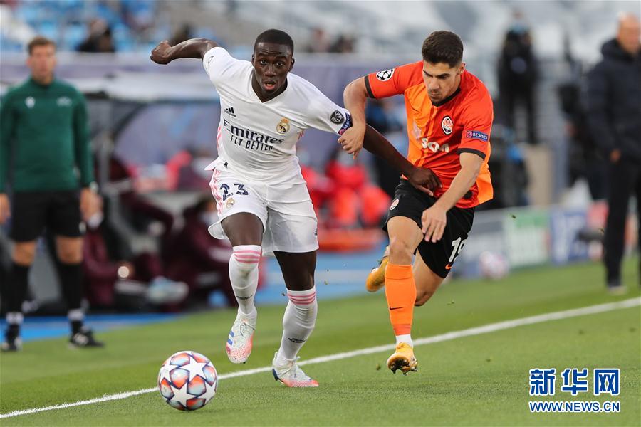 10月21日,皇家马德里队球员门迪(前左)与顿涅茨克矿工队球员马诺尔·所罗门在比赛中拼抢。 当日,在2020-2021赛季欧洲足球冠军联赛小组赛B组首轮比赛中,西甲皇家马德里队主场以2比3不敌乌克兰顿涅茨克矿工队。 新华社发(爱德华·皮特斯摄)