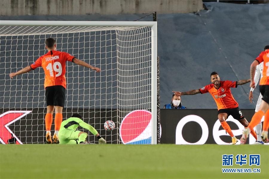 10月21日,顿涅茨克矿工队球员马诺尔·所罗门(左一)与邓蒂尼奥(右一)在比赛中庆祝皇家马德里队球员瓦拉内自摆乌龙进球。 当日,在2020-2021赛季欧洲足球冠军联赛小组赛B组首轮比赛中,西甲皇家马德里队主场以2比3不敌乌克兰顿涅茨克矿工队。 新华社发(爱德华·皮特斯摄)