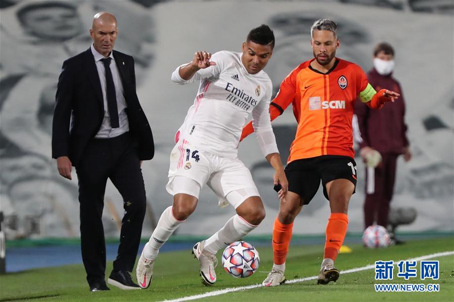 10月21日,皇家马德里队球员卡塞米罗(中)与顿涅茨克矿工队球员马洛斯(前右)在比赛中拼抢。 当日,在2020-2021赛季欧洲足球冠军联赛小组赛B组首轮比赛中,西甲皇家马德里队主场以2比3不敌乌克兰顿涅茨克矿工队。 新华社发(爱德华·皮特斯摄)