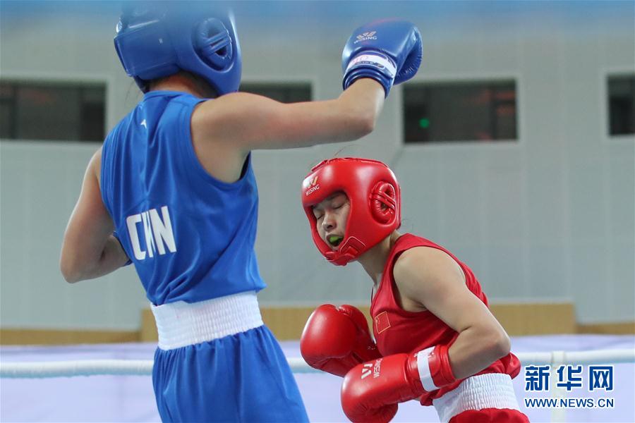 10月22日,常园(右)与吴愉在51公斤级决赛中。 当日,在河北省迁安市唐山九江体育中心进行的2020年“迁安杯”全国女子拳击锦标赛51公斤级决赛中,河北九江队选手常园以5比0战胜福建队选手吴愉,获得冠军。 新华社记者 欧东衢摄