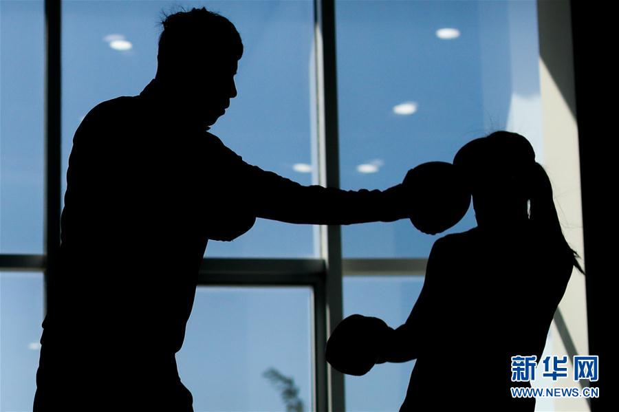 10月22日,常园(右)在休息室内训练。 当日,在河北省迁安市唐山九江体育中心进行的2020年“迁安杯”全国女子拳击锦标赛51公斤级决赛中,河北九江队选手常园以5比0战胜福建队选手吴愉,获得冠军。 新华社记者 欧东衢摄