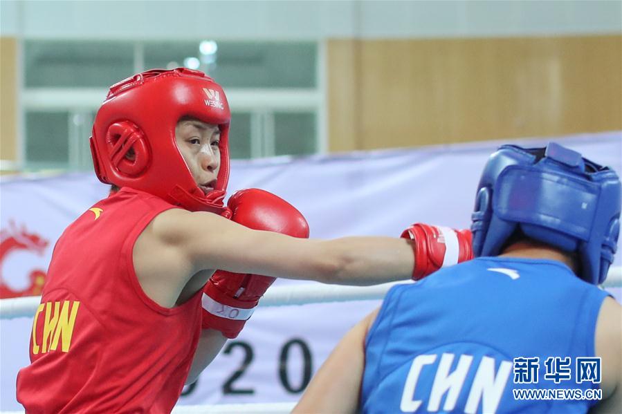 10月22日,常园(左)与吴愉在51公斤级决赛中。 当日,在河北省迁安市唐山九江体育中心进行的2020年“迁安杯”全国女子拳击锦标赛51公斤级决赛中,河北九江队选手常园以5比0战胜福建队选手吴愉,获得冠军。 新华社记者 欧东衢摄