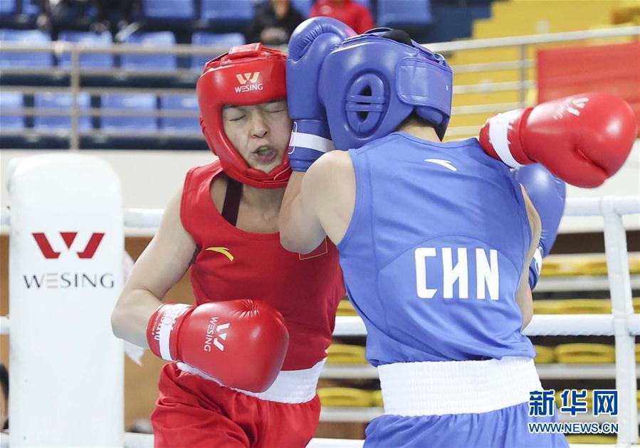 10月22日,常园(左)与吴愉在51公斤级决赛中。 当日,在河北省迁安市唐山九江体育中心进行的2020年“迁安杯”全国女子拳击锦标赛51公斤级决赛中,河北九江队选手常园以5比0战胜福建队选手吴愉,获得冠军。 新华社记者 杨世尧摄