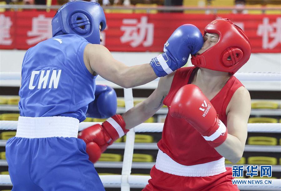 10月22日,常园(右)与吴愉在51公斤级决赛中。 当日,在河北省迁安市唐山九江体育中心进行的2020年“迁安杯”全国女子拳击锦标赛51公斤级决赛中,河北九江队选手常园以5比0战胜福建队选手吴愉,获得冠军。 新华社记者 杨世尧摄