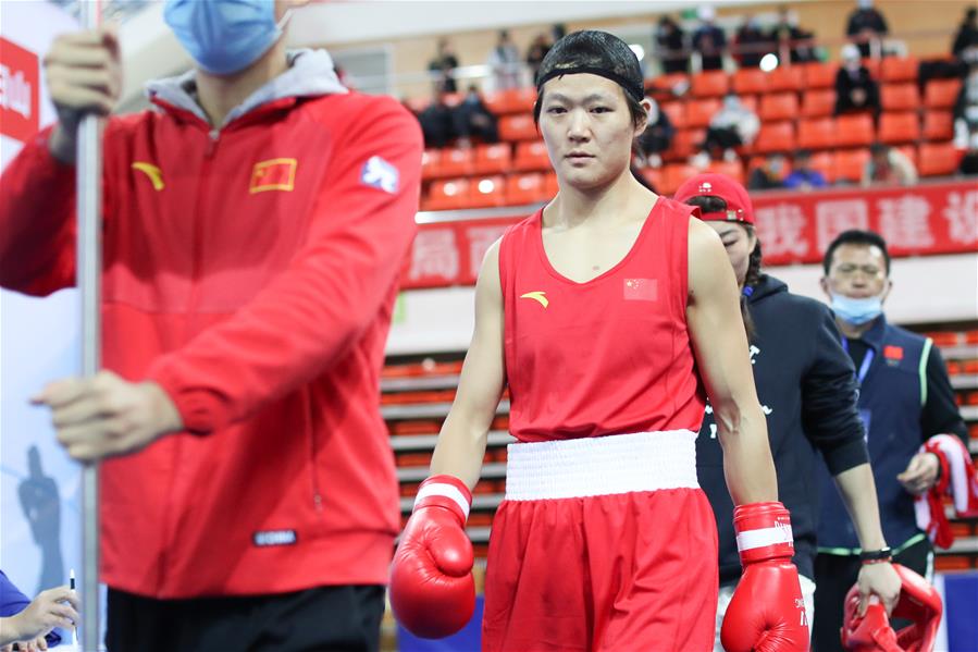 10月22日,陕西队选手谷红(左二)进入赛场。 当日,在河北省迁安市唐山九江体育中心进行的2020年“迁安杯”全国女子拳击锦标赛69公斤级决赛中,陕西队选手谷红以4比1战胜内蒙古队选手杨柳,获得冠军。 新华社记者欧东衢摄