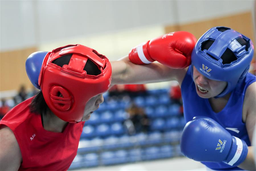 10月22日,宁夏队选手朱晓琳(右)与安徽队选手张舒洁在81公斤级决赛中。最终,朱晓琳在81公斤级决赛中以4比1战胜张舒洁,夺得冠军。 当日,2020年“迁安杯”全国女子拳击锦标赛在河北省迁安市唐山九江体育中心落幕。 新华社记者 欧东衢 摄