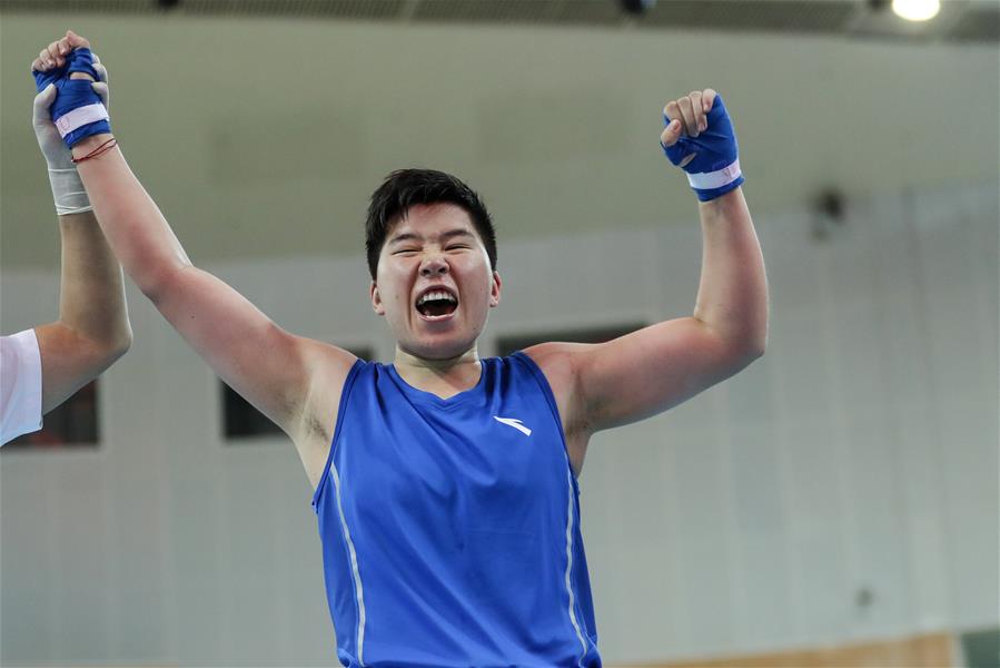 10月22日,宁夏队选手朱晓琳在获胜后庆祝。朱晓琳在81公斤级决赛中以4比1战胜安徽队选手张舒洁,夺得冠军。 当日,2020年“迁安杯”全国女子拳击锦标赛在河北省迁安市唐山九江体育中心落幕。 新华社记者 欧东衢 摄