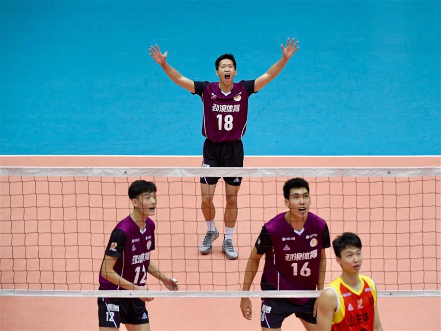 10月22日,四川队球员李蕊(左二)、蒋志源(左一)、彭世坤(右二)等庆祝得分。 当日,在福建省漳州体育训练基地举行的2020年全国男排锦标赛A组小组赛中,四川队以3比1战胜山东队。 新华社记者 姜克红 摄
