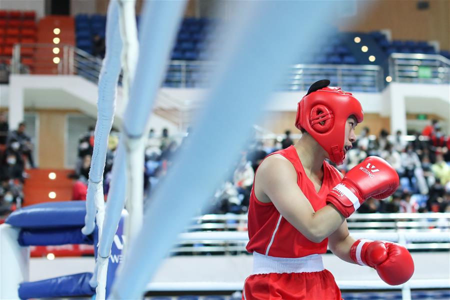 10月22日,江苏队选手李倩格在64公斤级决赛中。 当日,在河北省迁安市唐山九江体育中心进行的2020年“迁安杯”全国女子拳击锦标赛64公斤级决赛中,江苏队选手李倩格以5比0战胜安徽队选手周文静,获得冠军。 新华社记者欧东衢摄