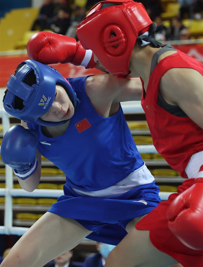 10月22日,湖北队选手禹立赛(左)与四川队选手杨文璐在60公斤级决赛中。 当日,在河北省迁安市唐山九江体育中心进行的2020年“迁安杯”全国女子拳击锦标赛60公斤级决赛中,湖北队选手禹立赛以5比0战四川队选手杨文璐,获得冠军。 新华社记者杨世尧摄