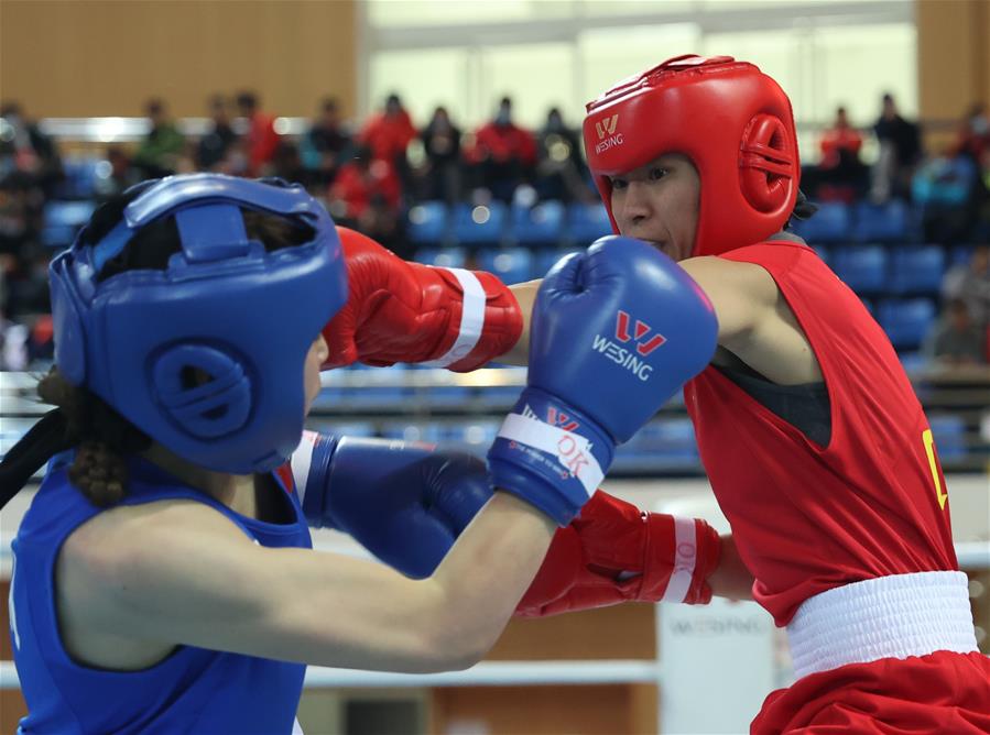 10月22日,湖北队选手禹立赛(左)与四川队选手杨文璐在60公斤级决赛中。 当日,在河北省迁安市唐山九江体育中心进行的2020年“迁安杯”全国女子拳击锦标赛60公斤级决赛中,湖北队选手禹立赛以5比0战四川队选手杨文璐,获得冠军。 新华社记者杨世尧摄