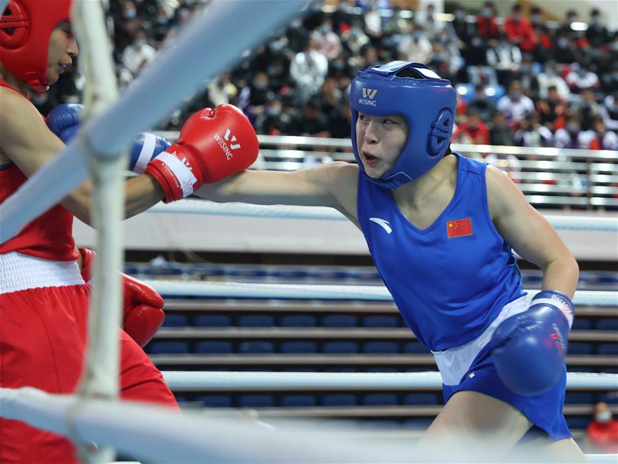 10月22日,湖北队选手禹立赛(右)与四川队选手杨文璐在60公斤级决赛中。 当日,在河北省迁安市唐山九江体育中心进行的2020年“迁安杯”全国女子拳击锦标赛60公斤级决赛中,湖北队选手禹立赛以5比0战四川队选手杨文璐,获得冠军。 新华社记者杨世尧摄